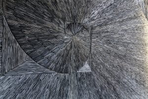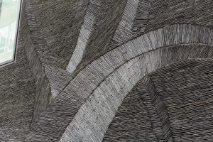 The artwork is akin to a graphite pencil drawing with subtle shading and tonalities that shift and change as the light plays on the slate surface. The colour of the slate echoes the tall grey towers, iconic landmarks of The David Attenborough Building. Constructed from layers of slate that create a sense of rock strata, within the wall are discrete spaces to attract a range of wildlife including bats, solitary bees, spiders and insects. The Museum of Zoology launched a project with local schools and over 3,000 snail shells were collected, many of which a hidden with Slate Wall South.